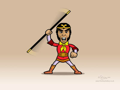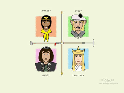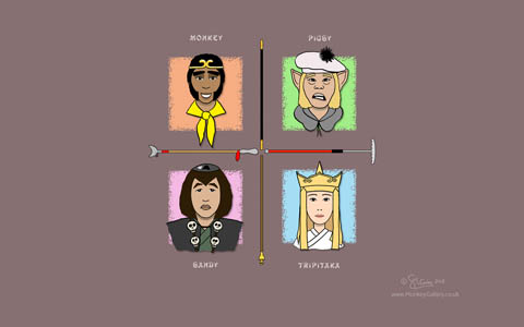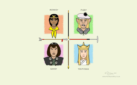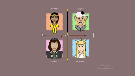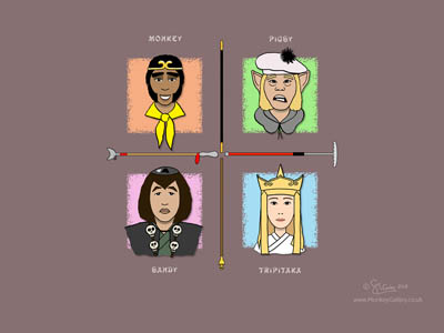 The story describes the journey of a young buddist priest, Tripitaka, as he makes his way from China to India to retrieve Buddist scriptures. He is escorted on his quest by three campanions: Monkey (the mischievous and fight-hungry monkey king), Pigsy (a pig monster with an eye for pretty ladies) and Sandy (a miserable water monster), who help to ward off the many demons and monsters that turn up on the way.